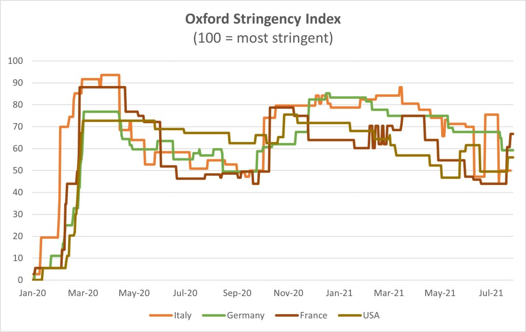 And that is precisely the point. By and large, all the major Western countries imposed similar restrictions at the same time, then followed similar paths toward a cautious re-opening. Actually, if you want to be pedantic, Europe has even been a bit more restrictive than the US. But let’s not get pedantic. Ok, if you insist, because you are a truly nerdy type and won’t read further before finding out how this stuff is measured, take a look here.