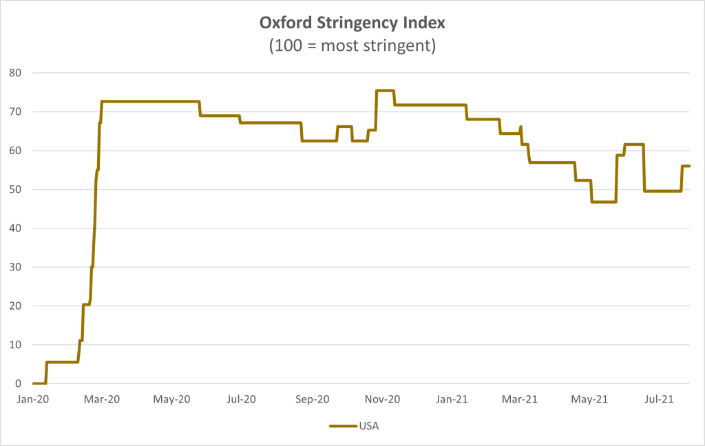 For evidence of this, take a look at the following graph. It shows the Oxford Stringency Index, a measure of the intensity of restrictions that were put in place after the pandemic hit the US in early 2020. You can see clearly that the restrictions were ramped up quickly but have only been eased slowly. We still have a long way to go before things return to normal. So, yes, we are still in a transitional period.