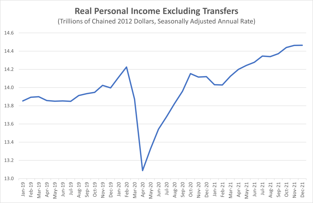 So, we must be missing something. What is it? Well, there’s a clue right there, in the title of the chart. If you look closely you see that it says “excluding transfers”. That means excluding payments from the government, like unemployment benefits and stimulus checks. And transfers positively soared during the pandemic. Just look at the chart below (this time, in nominal dollars).