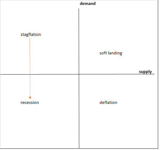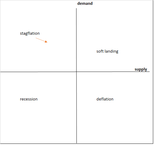 We can visualize the Fed’s strategy by considering the following diagram. It shows four quadrants, based on the strength of aggregate demand and aggregate supply. Right now, we are in the northwest quadrant, where demand is strong but supply is weak. Since demand exceeds supply we have inflation. And since supply (of workers and hence output) is weak, the economy is stagnating. There’s a technical term for this: stagflation.
