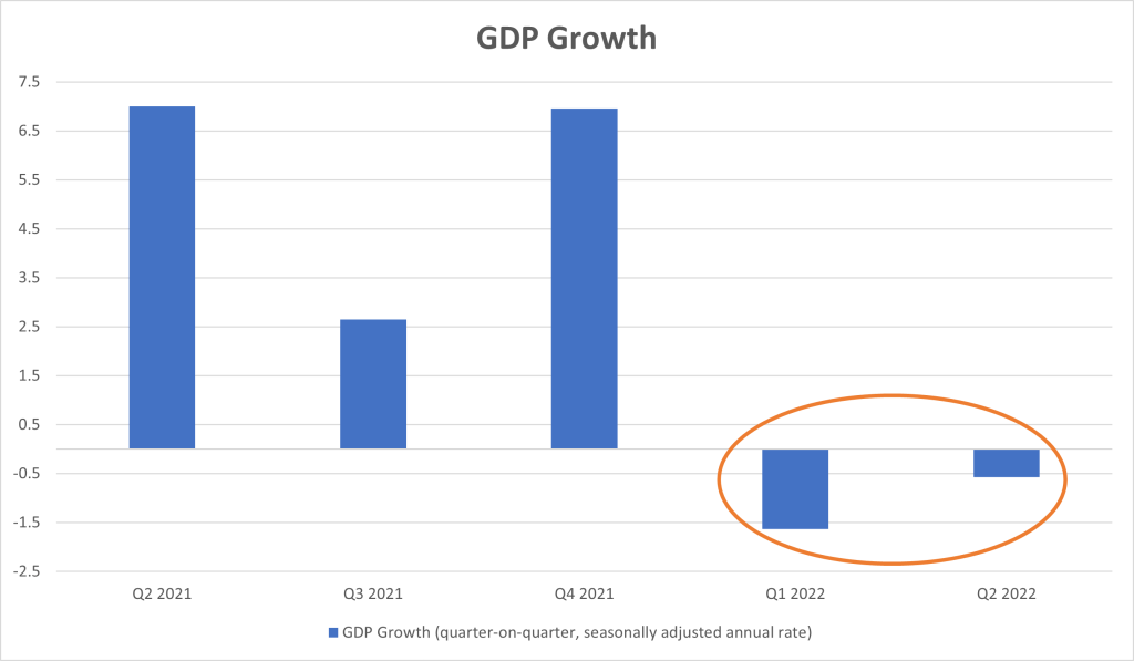 Um, plenty. The first problem for the Fed is that it doesn’t have a firm grasp of the current situation. It’s not really their fault, because the current situation is, well, confusing. As you can see from the chart, the economy has now contracted for two consecutive quarters. And yes, normally that is pretty much the definition of a recession. So, yes, President Biden was engaging in politics when he denied this claim. That, ahem, is what politicians do.