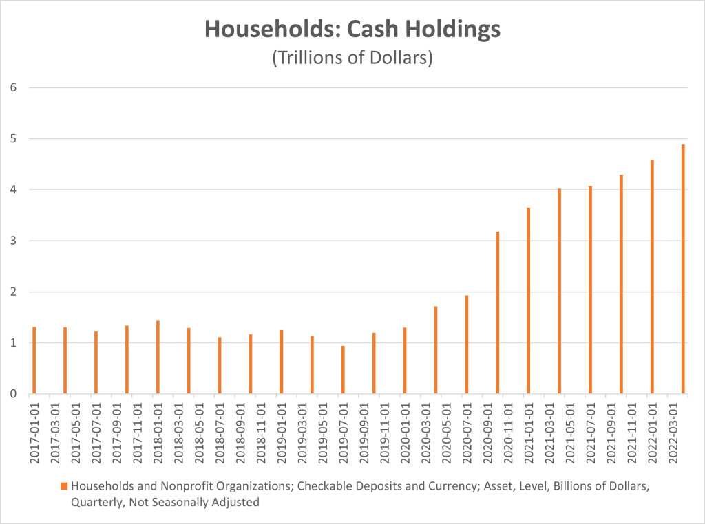 Why are relatively few people looking for work? The truth is that we don’t know the answer. But we have a few clues. One is that people are still sitting on a lot a cash, which they accumulated when the government kindly sent them a series of checks during the pandemic. Most people don’t know how large this stimulus really was. So, take a look at this chart of cash holdings, by which I mean actual cash plus the money in checking accounts. You can see that before the pandemic households had been holding around $1 trillion in cash. But then came the stimulus checks and suddenly these holdings quadrupled to $4 trillion, and then quintupled to $5 trillion.