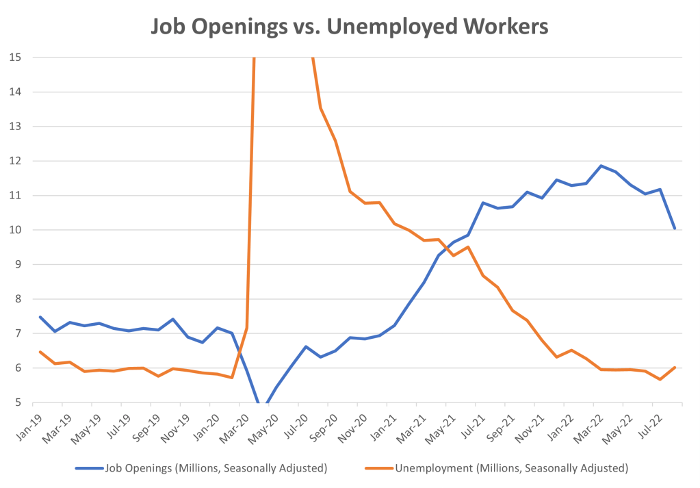 Now, consider the outlook. Perhaps the best way to think about things is to consider the following chart. Again, focus on the right-hand side. You can see that job openings (blue line) are at an exceptionally high level. In other words, employers are desperately looking for workers. But there are relatively few people looking for work (orange line).